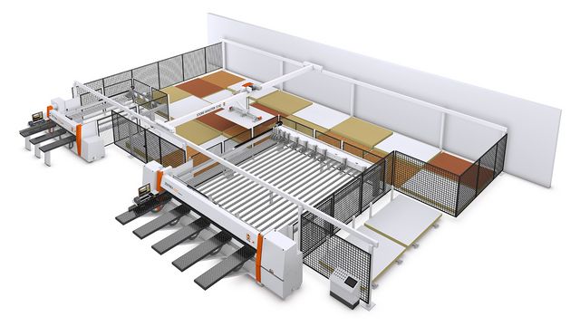 Angebunden sind die Druckbalkensäge ZENTREX 6220 für hohe Kapazitäten im Serienzuschnitt und das CNC-Bearbeitungszentrum DYNESTIC 7532/7535 für die individuelle Auftragsfertigung im Nestingbereich mit der Möglichkeit zu Fräsen, Bohren und zu Sägen.